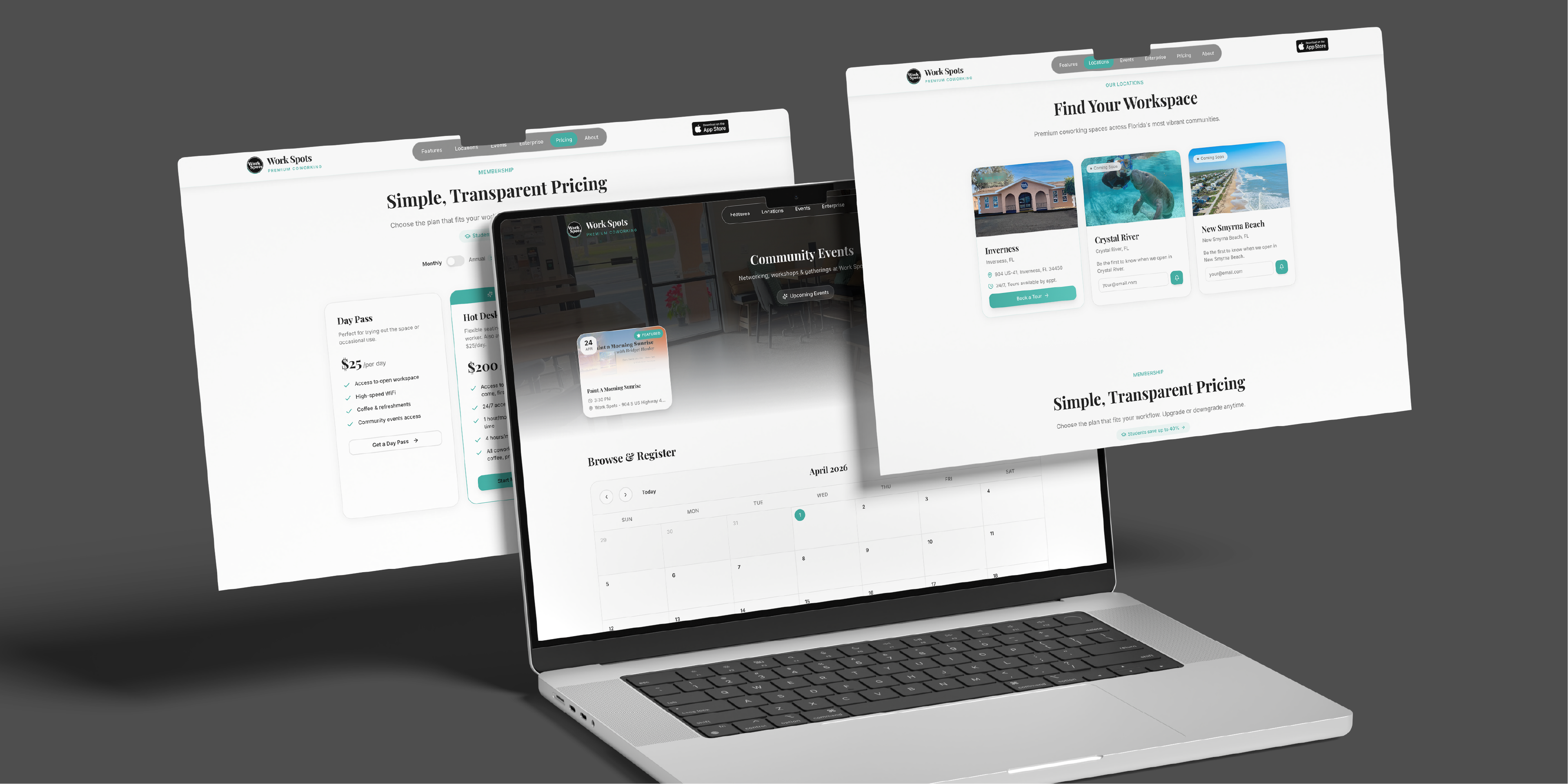 Work Spots had a bold idea: bring premium coworking to the Florida communities that big coworking brands have always overlooked. Rather than planting a flag in the state's major metros, they set their sights on smaller markets where remote workers, freelancers, and small business owners had nowhere to go between their kitchen table and the nearest coffee shop. The concept was sharp and the opportunity was real, but they needed a brand, a website, and a booking platform built from scratch to match the ambition of what they were building. Everything needed to feel premium, cohesive, and ready to scale from day one.
